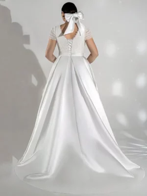 Suknia Ślubna Plus Size – Moda dla Krągłości to ponadczasowa suknia celebrująca każdą krągłość z elegancją i stylem. Ma dekolt w kształcie litery V, krótkie rękawy i klasyczny krój w linii A, zapewniając komfort i szyk.